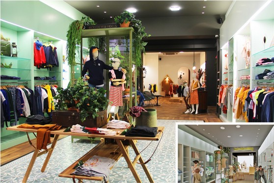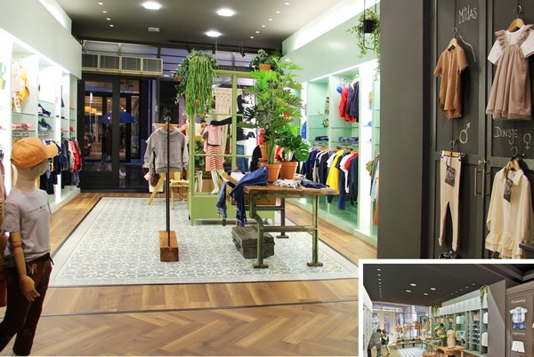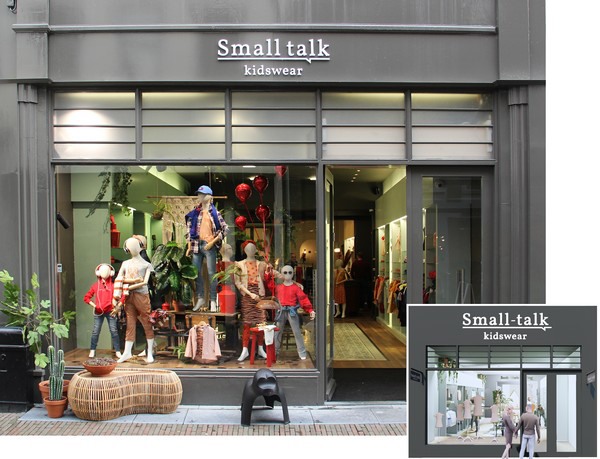 Het pand van de kinderkledingzaak is lang en smal. De grootste uitdaging was om de klanten ook achterin de winkel te krijgen. Door slim kleurgebruik en tactische positionering van de inrichting is een zuigende werking in de looproute ontwikkeld; de achterzijde van de