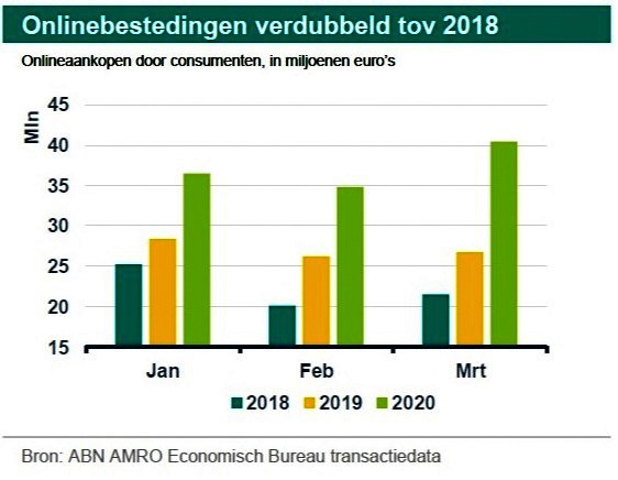 "Vooral de toename van de aankoop van huis-, tuin- en interieurartikelen is opvallend. Onder deze categorie vallen bouwmarkten, woonwinkels en tuincentra. In de week na 12 maart namen de uitgaven in deze categorie met gemiddeld 25% toe. Daarna volgde een sterke afname: de afgelopen drie zondagen werd gemiddeld 40% minder huis- en tuinartikelen verkocht dan op reguliere zondagen. Door de intelligente lockdown is het aantal activiteiten buitenshuis gereduceerd en is er meer tijd om te klussen. Het is niet ondenkbaar dat in de week na de aankondiging van de intelligente lockdown mensen bang waren voor een volledige lockdown en daarom deze aankopen alvast deden. Ook de verkoop (voornamelijk online) van elektronica steeg sterk (50%) in de week na de aankondiging van de lockdown. Daarna liepen de bestedingen aan elektronica langzaam terug. Deze aankopen hadden voor een deel te maken met het verplicht thuiswerken en waren dus anders niet gedaan. Maar de aanschaf van andere soorten elektronica, zoals televisies en keukenapparaten, is waarschijnlijk wel vervroegd."
