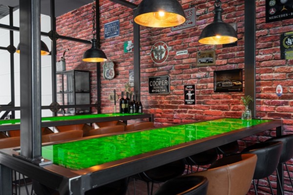 Deze klant had specifieke wensen en wilde iets dat niet standaard is. Duurzaamheid en originaliteit moesten centraal staan, maar wel met luxe uitstraling. Voor deze “mancave” heeft Magna oude Heineken flesjes verwerkt tot glaskeramiek. Met een prachtig resultaat! Het materiaal is van achteren verlicht en past op deze manier perfect bij de industriële inrichting van deze ruimte.
