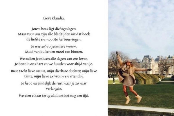 De op 20 mei 1970 in Schiedam geboren Claudia overleed op 24 juni in Oelegem (Belgiƫ). Vrienden en bekenden van haar reageren veelal geschokt, zoals ook blijkt uit de reactie van Isabel Devuyst op Facebook: