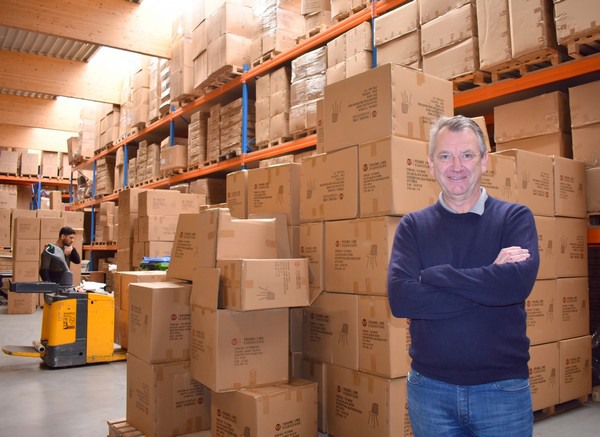 Met mede-eigenaar Jürgen Decruy bespreken we o.a. de uitbreiding van het assortiment en de impact van Covid-19 op het nog jonge bedrijf.Jürgen Decruy poseert in de opslagloods die in Izegem staat.