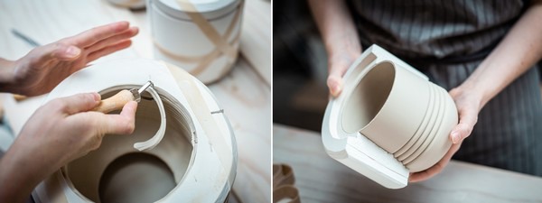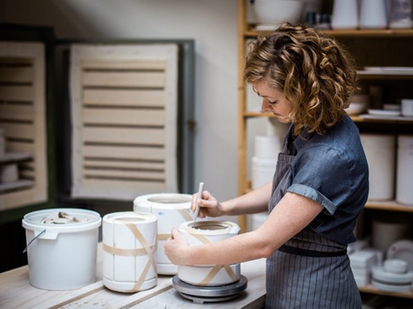 Inneke van der Werff bezig in haar atelier aan de Ribbel collectie.