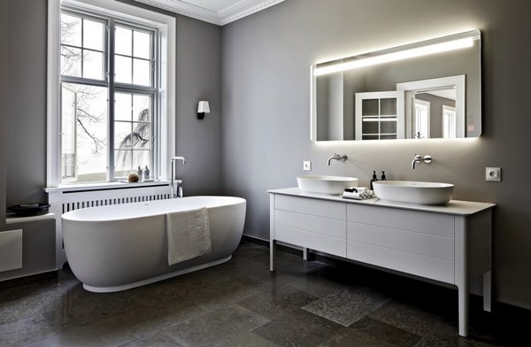 De in totaal 14 badkamers onderstrepen de exquise stijl van het pand. Passend bij het klassieke, moderne interieur zijn ze volledig uitgerust met producten uit de Luv-serie: ovale waskommen gecombineerd met consoletafels en ovale ligbaden. De badkamerserie combineert Scandinavische elegantie met zachte kleuren en is ontwikkeld door Duravit in samenwerking met Cecilie Manz. De internationaal succesvolle ontwerpster behoort tot de nieuwe generatie Deense ontwerpers die het Scandinavische designerfgoed vol vertrouwen voortzetten met verfijnde ontwerpen. Het feit dat Cecilie Manz in 2011 de Thorvald Bindesbøll Award ontving, is een interessante link naar de bewogen geschiedenis van Strandridergården.