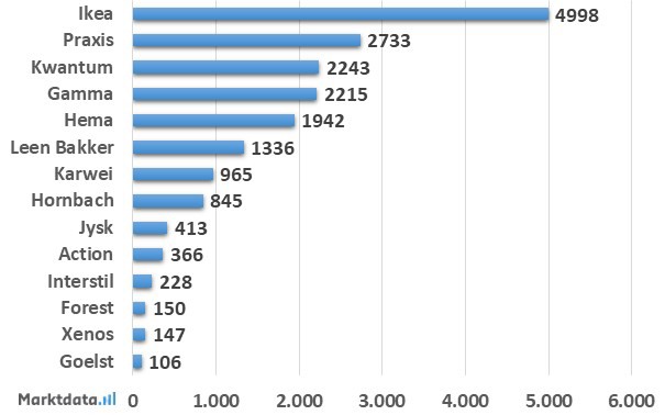 Het meest gezochte merk of winkelformule in de afgelopen vier jaar is Ikea. Over de afgelopen vier jaar werd er gemiddeld maandelijks bijna 5.000 keer gezocht op de zoekterm Ikea, gecombineerd met rail of roede. De top-5 wordt gecompleteerd door Praxis, Kwantum, Gamma en Hema. Uit de ranglijst blijkt dat men voornamelijk op winkelformules zoekt naar rails en roedes en slechts zeer beperkt op merknamen.
