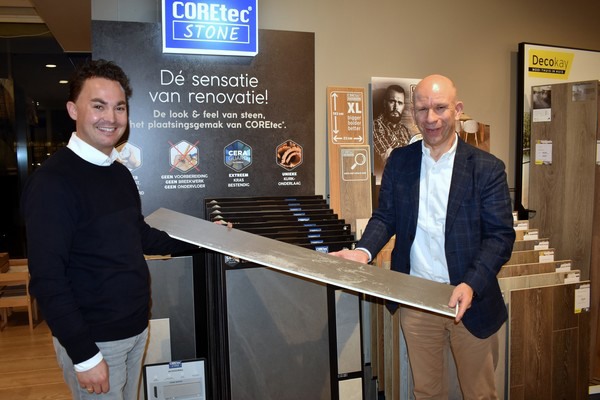 Afgelopen week kwam Philiep Caryn namens COREtec (USFloors) op werkbezoek in de Thoolse vestiging van Decokay. Wonen360 mocht daar bij zijn. Uit de gesprekken tussen Elenbaas en Caryn kwam duidelijk naar voren dat ze bij Elenbaas Noom blij zijn met de vloeren van COREtec. Jan Elenbaas: "Ze hebben een mooie productgroep. Gelijk al vanaf het begin heeft COREtec als merk een andere positie ingenomen. Het akoestische dempend effect (maximaal 10 decibel) was gelijk een prettig uitgangspunt, om dat met de consument te delen. Verder zijn we te spreken over de goede klikverbinding. Veel andere merken voldeden niet aan deze criteria. Daarnaast zijn we blij met het feit dat de gelegde COREtec-vloeren weinig tot geen klachten opleveren. Een iets hogere winstmarge zou overigens wel fijn zijn", gaf Elenbaas aan.