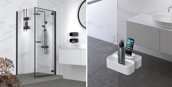 In veel badkamers blijkt er onvoldoende opbergruimte aanwezig te zijn, waardoor flessen shampoo en flacons en andere verzorgingsproducten regelmatig op de douchevloer staan. Bovendien wordt de telefoon steeds vaker mee de badkamer ingenomen. Al deze producten verdienen een goede opbergplek. Met de toevoeging van het ophangdoucherek en de clip-on mand, is met Frame elke douche geordend en elk product binnen handbereik.