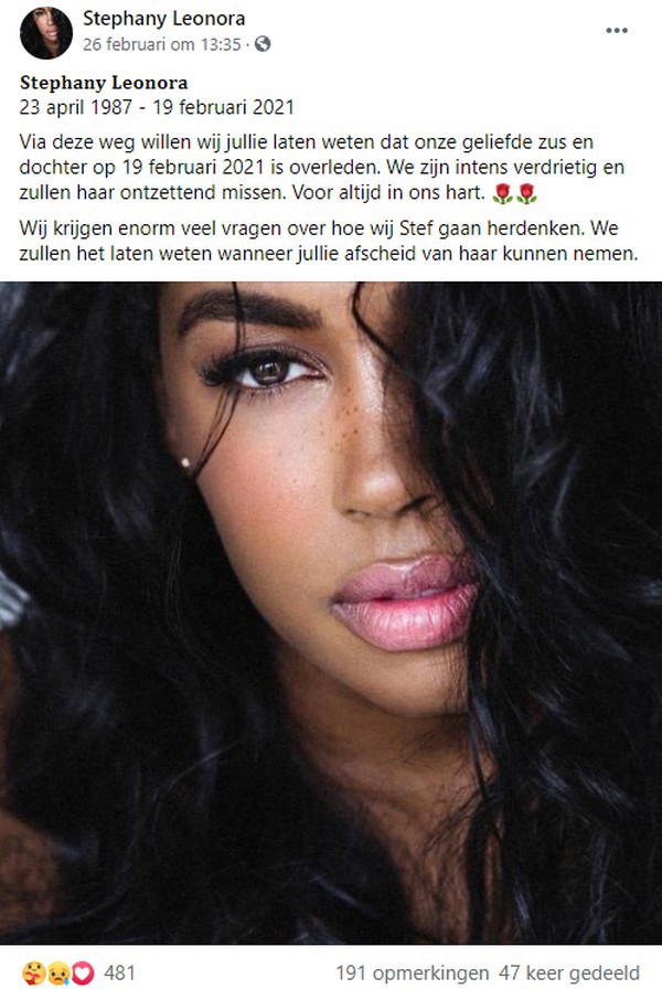 Het gaat hier om de 33-jarige Stephany Leonora, een goede vriendin van de Rotterdamse rapper en make-upartiest Jaysira Ravenberg. 'Beide vrouwen kwamen, samen met een gezamenlijke vriend (26), om het leven toen ze onderweg naar de hoofdstad frontaal in botsing kwamen met een vrachtwagen. De truckbestuurder zou volgens Ghanese media door een mechanisch defect de controle over zijn voertuig hebben verloren. Daardoor belandde hij op de verkeerde weghelft en botste op de auto waarin de drie Nederlanders zaten', meldt het AD.