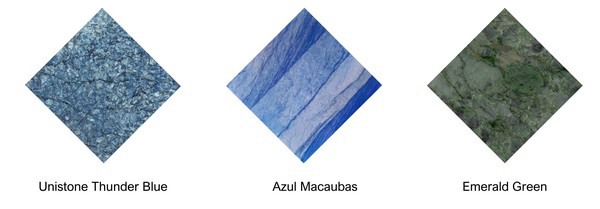 "Blauw en groen vind je ook terug in ons aanbod natuursteen en samengestelde materialen. Thunder Blue van Unistone is een kwartscomposiet die zich uitstekend leent voor binnentoepassingen.