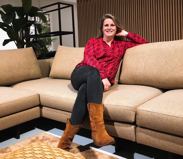 Accountmanager Angelique van Orsouw poseert op een van de banken (Naomi) die Meubitrend in het assortiment heeft.