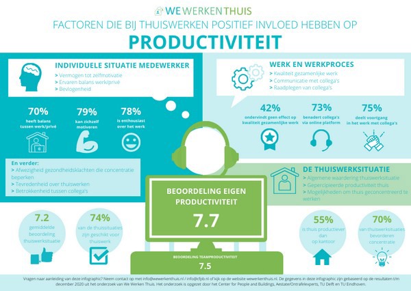 De ervaren productiviteit van thuiswerkers hangt blijkens het onderzoek We Werken Thuis onder meer samen met de werk-privé balans, de mate waarin men in staat is tot zelfmotivatie en het enthousiasme over het werk. Ook de eigen gezondheidssituatie en de betrokkenheid tussen collega’s spelen een rol.