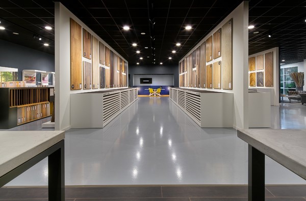 “Onze showroom is groot maar toch overzichtelijk opgezet met grote overzichtelijke ladekasten maar ook op de wanden zijn de vloeren op een goed formaat gepresenteerd.”