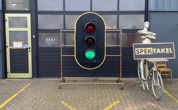 Met de nieuwe maatregelen mogen wij 25 personen tegelijk ontvangen. Ik had nog twee hele grote stoplichten in mijn loods liggen. Eentje hebben we van de week meteen gemaakt en voor de winkel neergezet. Heerlijk om het groene licht te zien branden."