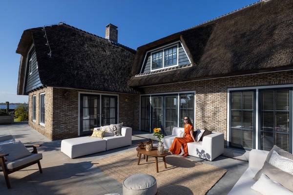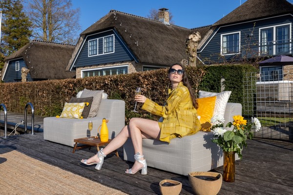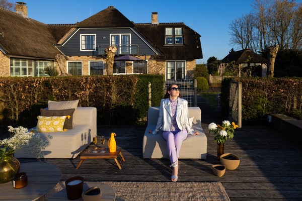 Manon Idema, eigenaresse van Outdoor Lifestyle en moeder van het model op de foto: ''Super leuk dat ze onze producten ook gebruiken bij het promotiemateriaal van deze prachtige villa aan het water in Vinkeveen.