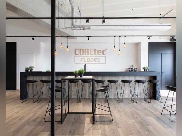 In een bedrijf als COREtec, met een familiaire uitstraling, mag een bar uiteraard niet ontbreken. Op de vloer ligt Mix Nimbus 50 LVRE 140 - Regina 50 LVRE 139 (Authentics).