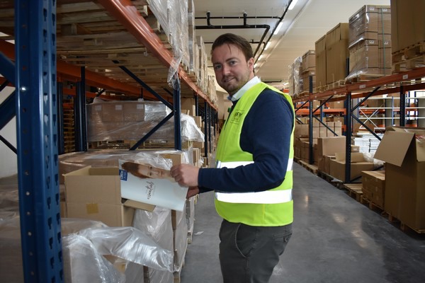 Nicolas Cnudde in het magazijn waar onder andere brochures en stalen (die op verzoek worden verstuurd) liggen opgeslagen.