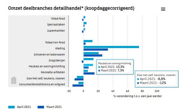 De omzet van de winkels in recreatieartikelen, de winkels in meubels en woninginrichting en de drogisterijen was in april 2021 ook hoger dan een jaar eerder. Ook ten opzichte van april 2019 was de omzet van deze winkels hoger.