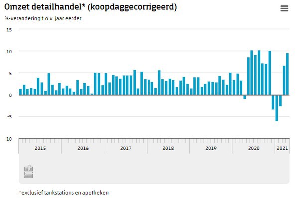 De detailhandel heeft in april 9,6 procent meer omgezet dan in april 2020, meldt het CBS. Het verkoopvolume was 8,8 procent hoger. Zowel de omzet van de non-foodsector als van de foodsector groeide. Daarnaast is online 18,6 procent meer omgezet door de detailhandel. In vergelijking met april 2019 lag de omzet van de detailhandel 8,5 procent hoger in april 2021.