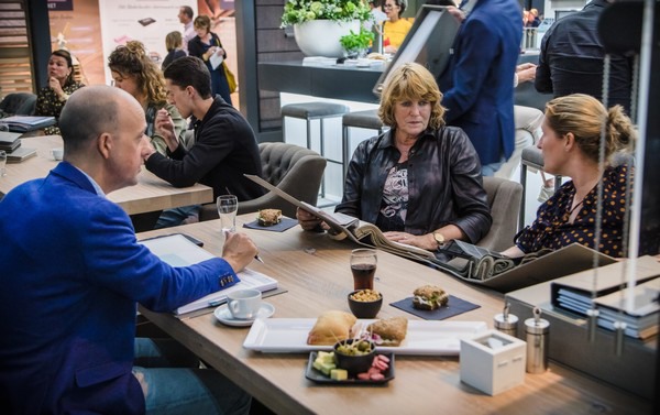 Bezoekers op de stand van Zonnelux, genietend van de verzorgde catering.