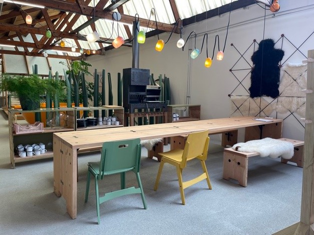 De hierboven genoemde visie van Weltevree is direct terug zien in de showroom: gezellig, gekleurde Stringlights die de oude fabriekshal verlichten, de nieuwe Bended serie, die onlangs is gelanceerd, meerdere Dutchtubs en de populaire Fieldchairs, afgestyled met een zacht bontje. “Weltevree gaat om welbehagen en tevreden zijn met je omgeving. Oude boerderijen in Nederland zijn hier vaak naar vernoemd. Het is een huiselijk gevoel: daar waar je op je plek bent.”