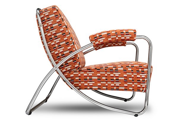 De fauteuil Dyker 20 is met de stof Metropolitan orange van Kirkby Design verkrijgbaar. Deze stof heeft een geometrisch dessin en werd in de jaren zestig en zeventig veel gebruikt op de chroombuisbankjes in de metro-treinen in London