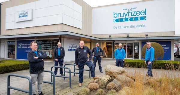 Links Martijn Kools met verschillende collega's voor een van de vestigingen van Bruynzeel Keukens.
