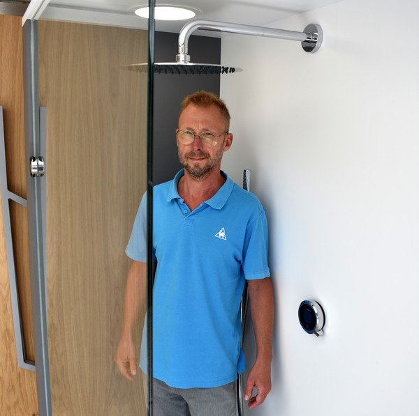 Eelke Keersemaker van Sanimex Design poseert in de demowagen van Aqualisa, bij een smartshower.
