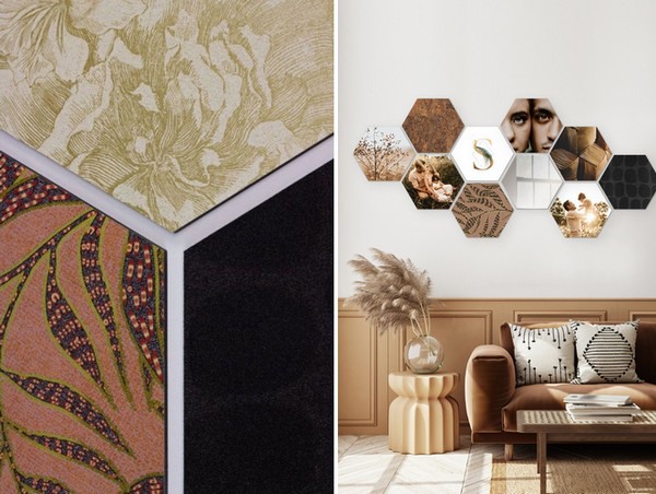 "Op de hexagon voor aan de muur kunnen klanten sinds kort kiezen voor een print van ons behang. Ze kunnen op deze manier op een speelse wijze het behang terug laten komen in hun interieur."