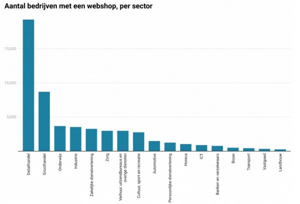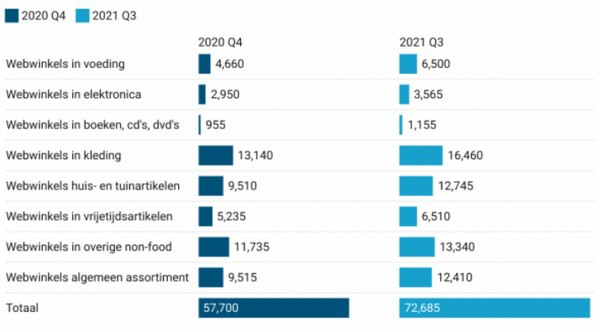 Over het geheel van de webshops is er een stijging van 17% geconstateerd. Dit blijkt uit cijfers van BoldData. Het totaal komt nu op 72.690 geregistreerde bedrijven als webshops. Bijna al deze nieuwe online ondernemers (83%) bestieren hun webshop vanuit huis. Het aantal nieuwe webshops in voeding groeide in 2021 het snelst met 39% (van 4.660 naar 6.500). Onder de nieuwe online winkeliers zien we specialisten in macarons en kaas. Zelfs aardappels worden met een paar klikken bij je thuisbezorgd. Ook het aantal webshops in huis- en tuin artikelen groeide hard met 34% (van 9.510 naar 12.745). Bonsaibomen en zelfs complete mierenboerderijen bestel je online. Het aantal webshops in elektronica steeg minder hard: van 955 naar 1.115.