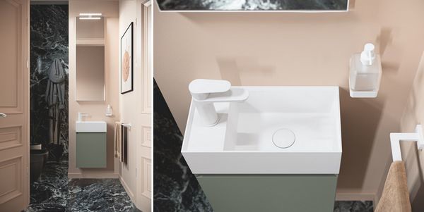 De geïntegreerde wastafel, lineair en essentieel, wordt voorgesteld in glanzend of ondoorzichtig wit mineraalgrijs, of in 15 mat gekleurde versies - waar nieuwe geraffineerde kleuren zoals denim blauw, salie groen en varen groen opvallen - om ton-sur-ton composities of interessante combinaties met de onderliggende basis te creëren.