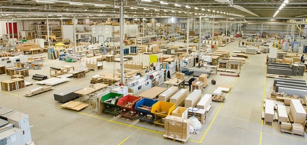 Een blik in de productiehal, waar in de afgelopen periode alleen al 5.400 keukens werden geproduceerd.