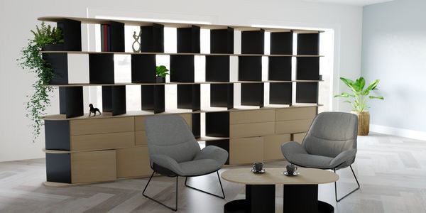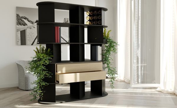 Met die filosofie is het bedrijf aan de slag gegaan met een divider, getekend door Mathias De Ferm en Toon De Somer. Het idee ontstond om een ruimte te verdelen in tweeën, om bijvoorbeeld aan de ene kant een zakelijke uitstraling en aan de andere een huiselijke look te krijgen. "Het geheel is opgebouwd uit MDF-platen van 12 mm afgeronde dikke platen van één, anderhalf, twee, drie en zelfs vier meter. De panelen worden ondersteund door een elegant gebogen 90 graden stalenplaat die op twee manieren kan geplaatst worden, waardoor er een andere inval ontstaat."