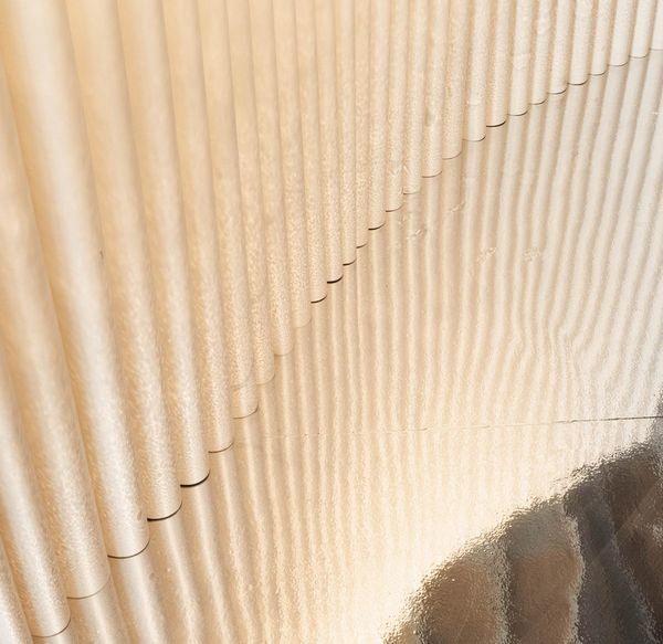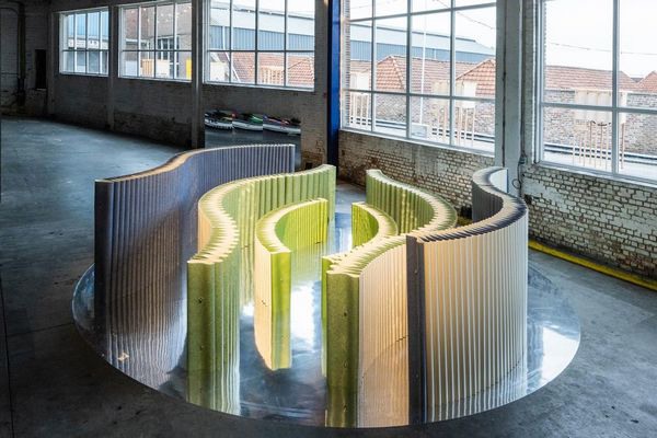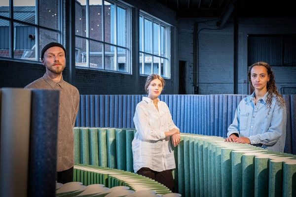 Jonge designers Isabeau Goddé en Amber Dewaele kregen met Sep aan hun zijde de expertise van een ervaren designer. “We zijn drie totaal verschillende profielen, maar net daardoor werkt het goed”, zegt Amber. “Isabeau is thuis in de textielwereld. Zij vergeleek al gauw het vinyl met een soort plooibaar leder wat ons hielp in de vormgeving. Ikzelf kom uit de meubelwereld en houd me graag bezig met de storytelling en de emoties die een product losmaken. Ik droeg voornamelijk bij aan de kleurkeuze en de zintuiglijke prikkels die de installatie kan voortbrengen.”
