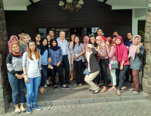 Jan-Wout Hulstein temidden van het officeteam in Surabaya.