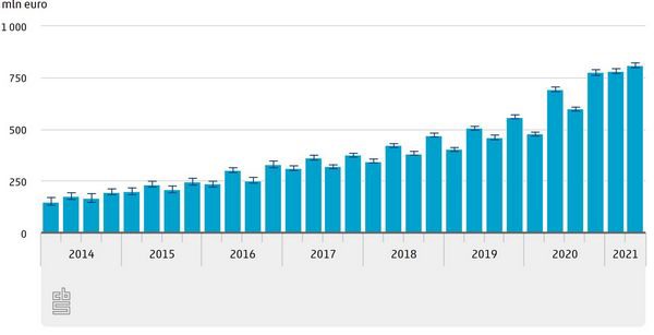 Sinds 2014 besteedden Nederlandse consumenten elk kwartaal meer bij Europese webwinkels dan in dezelfde periode een jaar eerder. Met name sinds het uitbreken van de coronacrisis stegen deze uitgaven sterk. In 2020 piekte de kwartaalgroei op ruim 38 procent en in de eerste drie maanden van 2021 werd een recordgroei van bijna 64 procent behaald. Na een volledig coronajaar was de groei in het tweede kwartaal van 2021 voor het eerst weer vergelijkbaar met de jaren voorafgaand aan de crisis.