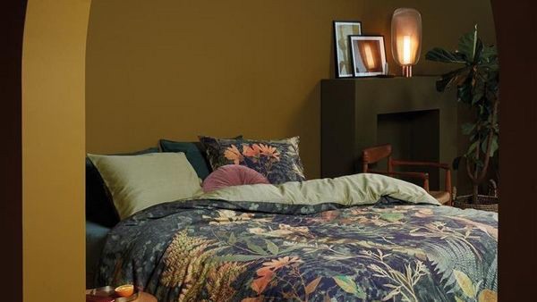 “Bij dit thema horen planten in de slaapkamer”, zegt Kristel de Jong. “De Zaagcactus, Calathea of Nestvaren zijn enkele mooie voorbeelden. Stoffen als fluweel passen hier ook mooi bij. Wie het aandurft om een muur of het plafond in het zwart of antraciet te schilderen, vindt in Gardens of Eden de stijl die daarbij aansluit. Qua bedlinnen bestaan de mogelijkheden vooral uit groene en warme rood/bruine tinten, al dan niet met floraalmotief. Ook het combineren van twee éénkleurige dekbedovertrekken of een effen kleur met een design met print kan een sfeervol effect teweegbrengen.”