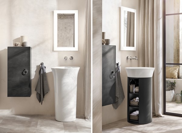 De variant als vrijstaand wastafelmeubel is eveneens een highlight. De exact passende meubelonderbouw is verkrijgbaar in vijf zijdemat en vijf hoogglans lakken. Bijzonder zijn de van de beide zijden toegankelijke glazen legplanken die extra opbergruimte bieden. De legplanken kunnen ook in houtvarianten (eiken natuur en Amerikaans noten) worden uitgevoerd.
