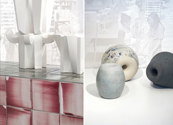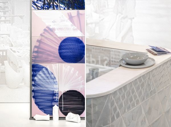 Studio Rens met RE-GLOW, waarbij gedateerde Mosa-tegels opnieuw worden bewerkt met kleuren glazuur. Mat en glans door elkaar levert een waar kunstwerk op.