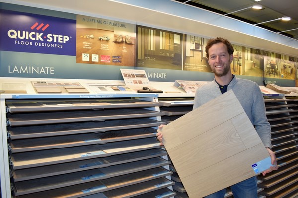 Marketingmanager Menno de Mol showt een vloerdeel van Quick-Step.