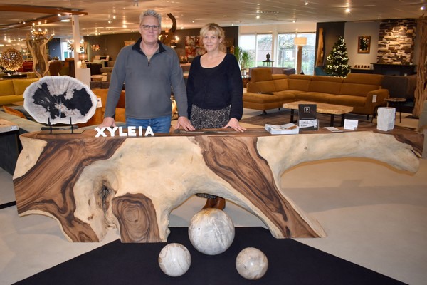 Xyleia Natural Interiors is al vijftien jaar dè specialist op het gebied van versteend hout en robuuste boomstamtafels. In Heeten beschikt het bedrijf over een showroom van 2500 m². Deze is zowel door consumenten als professionals te bezoeken. Daar wordt dan ook veelvuldig gebruik van gemaakt, al zijn veel ondernemers uit de Randstad niet snel bereid anderhalf uur in de auto te zitten om de toonzaal in Overijssel te bezoeken. "Maar als ze eenmaal hier zijn, zijn ze blij verrast. Hoe anders zijn Duitsers? Die trekken er met gemak een dag voor uit", zegt Jan Jaap. Zijn woorden worden bewaarheid als er juist die dag als we hem spreken een Duitse ondernemer met zijn echtgenote vanuit Bonn naar het hart van Salland, de streek tussen Deventer en Raalte, is afgereisd om flink in te kopen.
