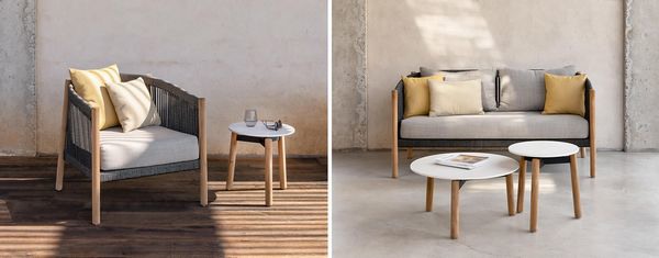 Het antracietkleurige touw en het warme teakhout passen perfect bij de salon- en bijzettafels van Lento. De tafels hebben een licht keramisch tafelblad, dat een ruimtelijk gevoel creƫert en tegelijkertijd structuur toevoegt.