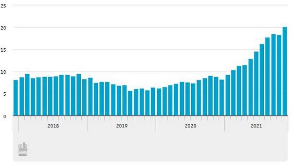 Bestaande koopwoningen waren in november 20,1 procent duurder dan een jaar eerder. Dat is een evenaring van de grootste prijsstijging sinds de start van de statistiek in 1995. Ook in februari 2000 kwam de prijsstijging op 20,1 procent uit. Destijds was de gemiddelde transactieprijs bijna 160 duizend euro. In november was dat iets meer dan 400 duizend euro. Dit blijkt uit onderzoek naar de prijsontwikkeling van bestaande particuliere koopwoningen in Nederland van het CBS en het Kadaster.