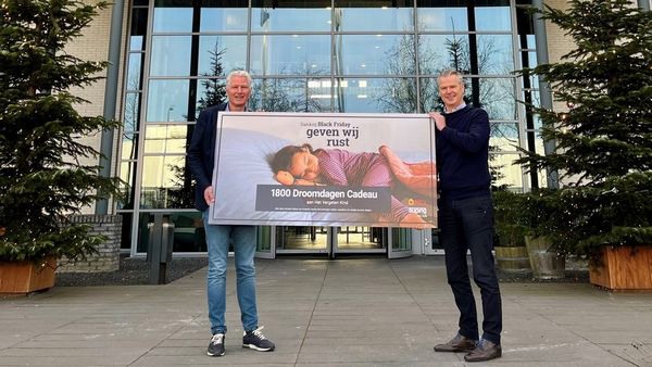 Op 22 december 2021 reikte Hans Kokkeel, Sales Directeur Auping Nederland, een 1,5 meter cheque met 1800 Droomdagen uitgereikt aan Jeroen van Woudenberg van Het Vergeten Kind.