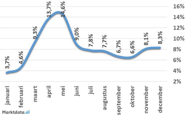 De bijna negen miljoen zoekopdrachten gerelateerd aan tuincentra over de afgelopen vier jaar zijn per maand geanalyseerd. Hierbij is gemeten hoe groot het zoekvolume-aandeel per maand is over de afgelopen vier jaar. Indien er iedere maand evenveel wordt gezocht, dus gelijkmatig over het hele jaar verdeeld, dan zou het maandelijkse aandeel in het zoekvolume 8,3% zijn (100%/12 maanden).