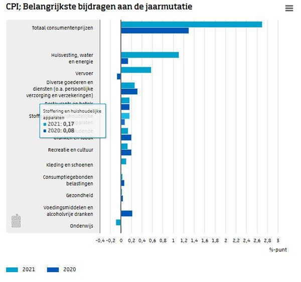 Consumentenprijzen waren in 2021 gemiddeld 2,7 procent hoger dan in 2020, maakt het CBS bekend. Vorig jaar was de prijsstijging 1,3 procent. Vooral de prijsontwikkeling van energie droeg bij aan de hogere inflatie in 2021.