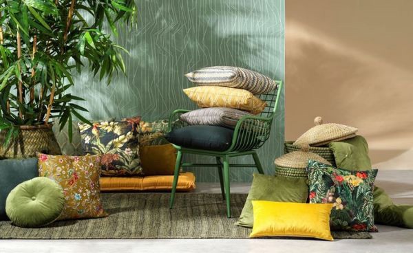 Een mooi voorbeeld van een kussen thema waar dit goed naar voren komt, is Ginger Jungle. Groene kleuren voeren de boventoon, maar kunnen goed gecombineerd worden met zachte beige of frisse gele en roze details.