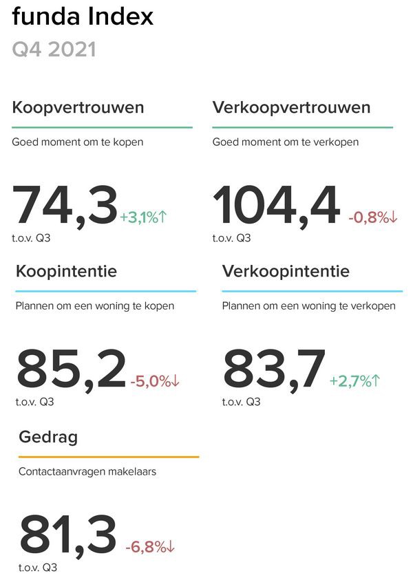 Uit de funda Index over het vierde kwartaal van 2021 blijkt dat de huidige koopintentie onder woningzoekers flink is gezakt. Wel gaan consumenten 2022 in met een iets stijgend koopvertrouwen. Deze trend is in september 2021 ingezet en de stijging zet zich gedurende het laatste kwartaal door. Aan de verkoperskant laat het vertrouwen juist een lichte daling zien, die in de toekomst waarschijnlijk ook doorzet. Het aantal mensen dat over zes maanden een gunstige markt voor verkopers verwacht, is 15% lager ten opzichte van eind 2021. Meer mensen verwachten in de loop van 2022 onaantrekkelijkere verkoopprijzen en hogere rentes.