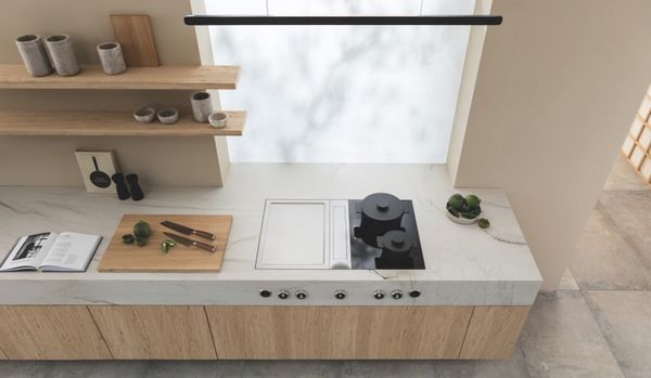 Bij het activeren van de afzuiging gaat de afsluitklep automatisch open en dicht. In uitgeschakelde modus is het systeem volledig gesloten. Het afzuigvermogen wordt onafhankelijk geregeld op basis van het huidige kookproces. De stille motor zorgt ervoor dat de afzuiging ook op hoge vermogensniveaus weinig geluid maakt. Onderdelen zijn eenvoudig te verwijderen en mogen gewoon in de vaatwasser, zonder dat de kwaliteit eronder te lijden heeft.
