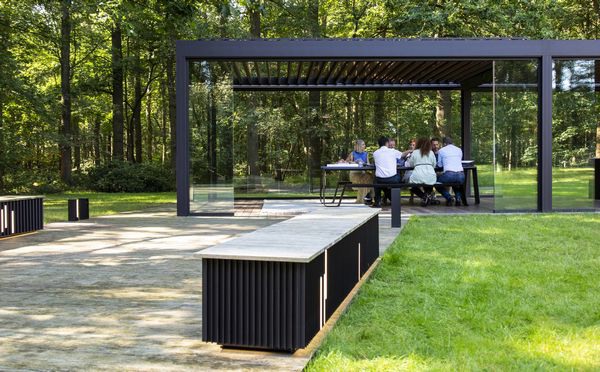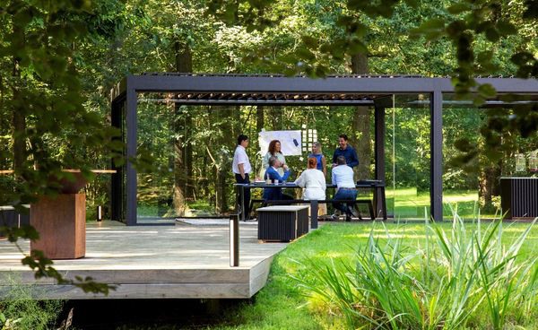 De buitenlucht maakt je hersenen actiever en creatiever. En dat allemaal met de luxe van een binnenkantoor. Door de daklamellen te kantelen bepaal je zelf hoeveel zon of schaduw je wenst, verwarmingselementen creëren de ideale temperatuur, het perfecte licht komt van de geïntegreerde leds en je zit helemaal beschut tegen de wind door de zij-invullingen.
