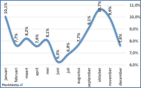 Het zoekvolume van de zoekopdrachten naar soorten vloerkleden over de afgelopen vier jaar is tevens per maand geanalyseerd. Hierbij is gemeten hoe groot het zoekvolume-aandeel per maand is over de afgelopen vier jaar. Indien er iedere maand evenveel wordt gezocht naar de soorten vloerkleden, dus gelijkmatig over het hele jaar verdeeld, dan zou het maandelijkse aandeel in het zoekvolume 8,3% zijn (100%/12 maanden). Onderstaand figuur toont het aandeel van het jaarlijkse zoekvolume per maand van zoekopdrachten naar vloerkleden over de afgelopen vier jaar. Daaruit valt af te lezen dat het zoekvolume in de zomermaanden relatief klein is ten opzichte van de andere maanden. In oktober, november en januari wordt er relatief veel gezocht naar vloerkleden. De maand oktober vertegenwoordigt 10,7 procent van het jaarlijkse zoekvolume.