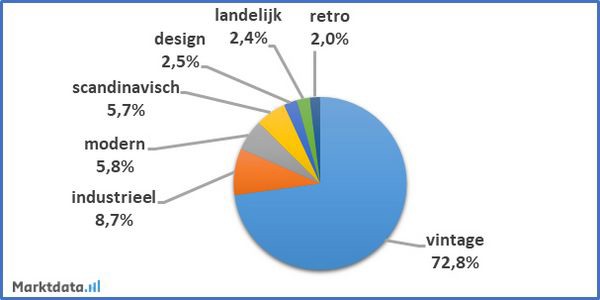 Veruit de meest gezochte woonstijl in relatie tot vloerkleden is vintage. De afgelopen vier jaar werd er gemiddeld ruim 18.300 keer per maand gezocht naar een vintage vloerkleed. Op de tweede plaats staat de industriële woonstijl, die bij veel andere interieurproducten nog altijd veruit de grootste groep vertegenwoordigt. De procentuele verdeling van de onderscheiden woonstijlen ziet er als volgt uit.